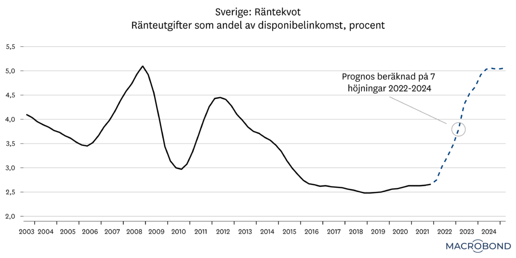 Enligt våra beräkningar, där vi justerar för förändringar i olika bindningstider på lån, skulle sju räntehöjningar innebära att svenskarnas ränteutgifter nära nog fördubblas. Vi skulle då komma upp till samma räntekvot som nåddes när räntan toppade 2008. Det innebär att en reporänta på 1,75 procent idag motsvarar en reporänta på 4,5–4,75 procent för 14 år sedan. Här kan man förvisso inflika att hushållen också har stora likvida tillgångar, inte minst inlåning. Men ett rimligt antagande är att merparten av de där tillgångarna inte finns hos de mest räntekänsliga hushållen.