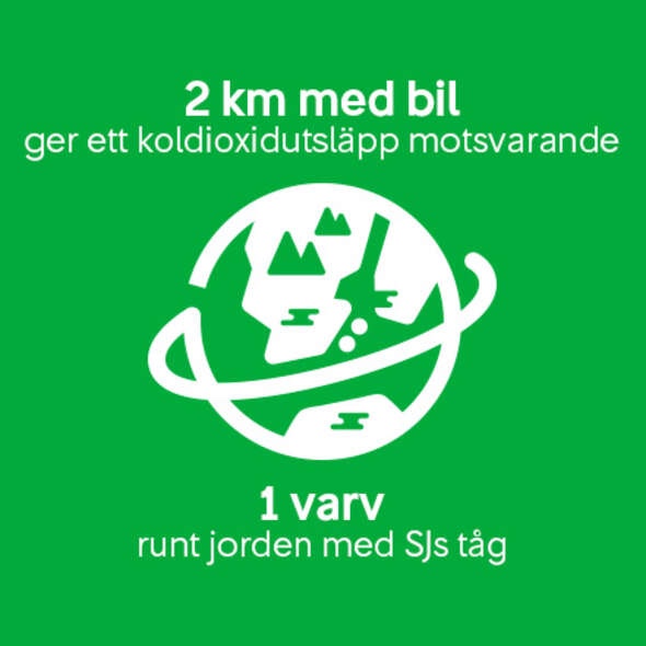 Att välja tåget är ett enkelt sätt att minska din påverkan på klimatet och miljön. En tågresa Stockholm–Göteborg för en person genererar koldioxidutsläpp motsvarande endast ett kryddmått bensin. Och 2 km bilresa genererar ett koldioxidutsläpp motsvarande 1 varv runt jorden med SJ’s tåg.