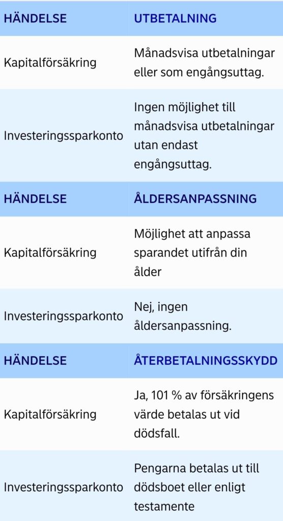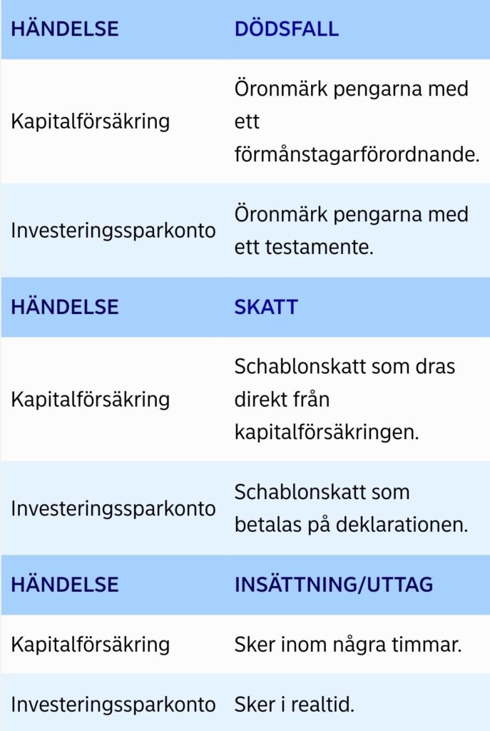 I tabellen nedan är några av skillnaderna mellan ISK och kapitalförsäkring